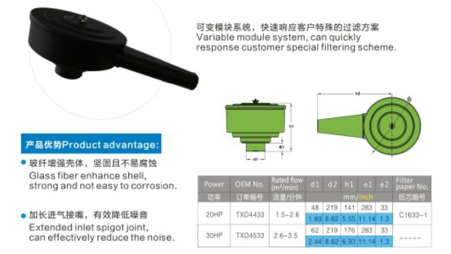 簡介:產(chǎn)品優(yōu)勢:玻纖增強殼體,堅固且不易腐蛀;加長進氣接嘴,有效降低噪音。可變模塊系統(tǒng),快速響應(yīng)客戶特殊的過濾方案。